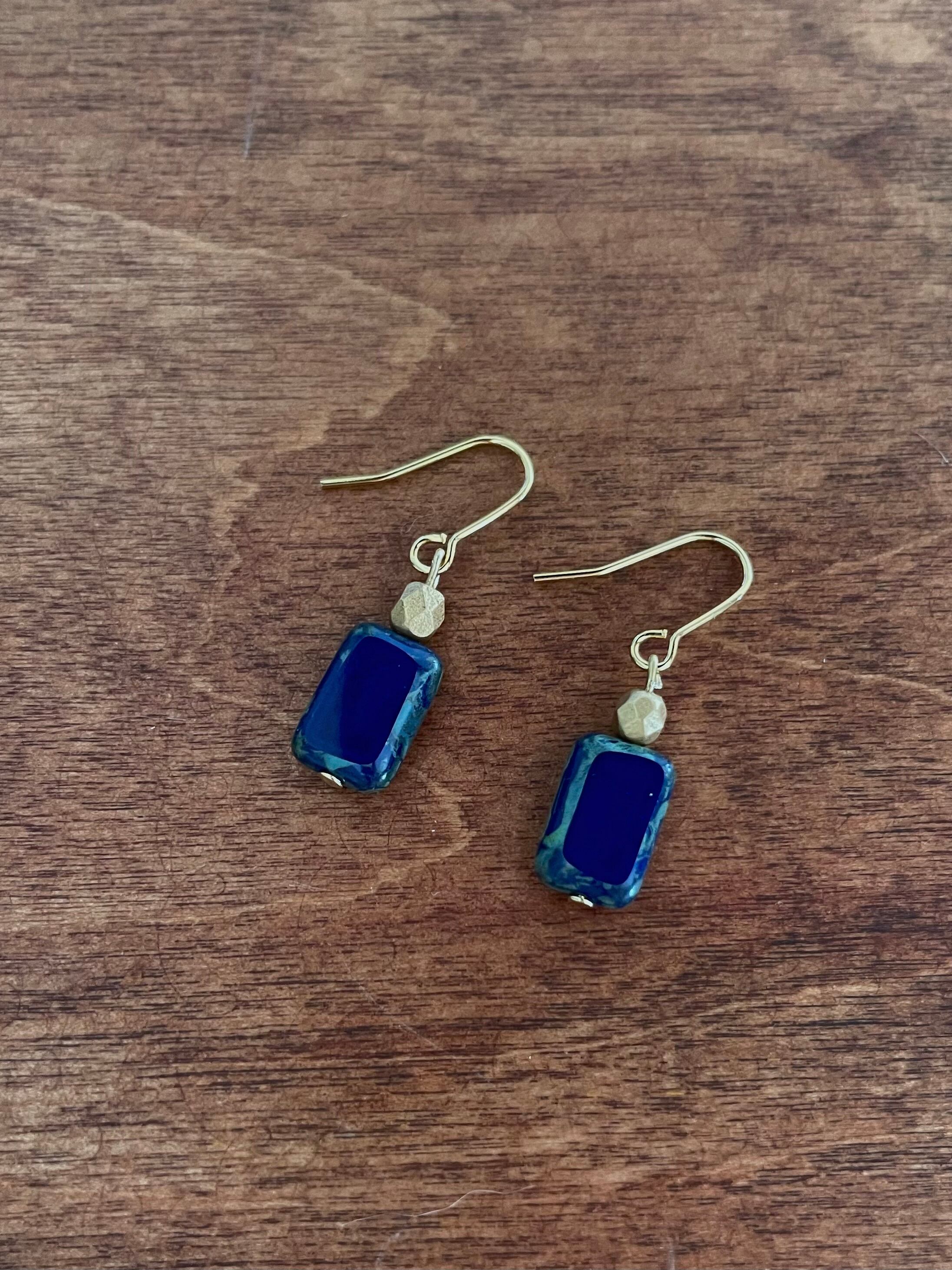 大理石より長持ちするといわれているトラバーチン。長方形で美しく濃いロイヤルブルーのトラバーチンにアンティーク風ゴールドカラーのビーズを合わせてピアスにしました。