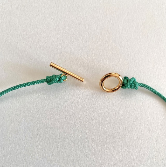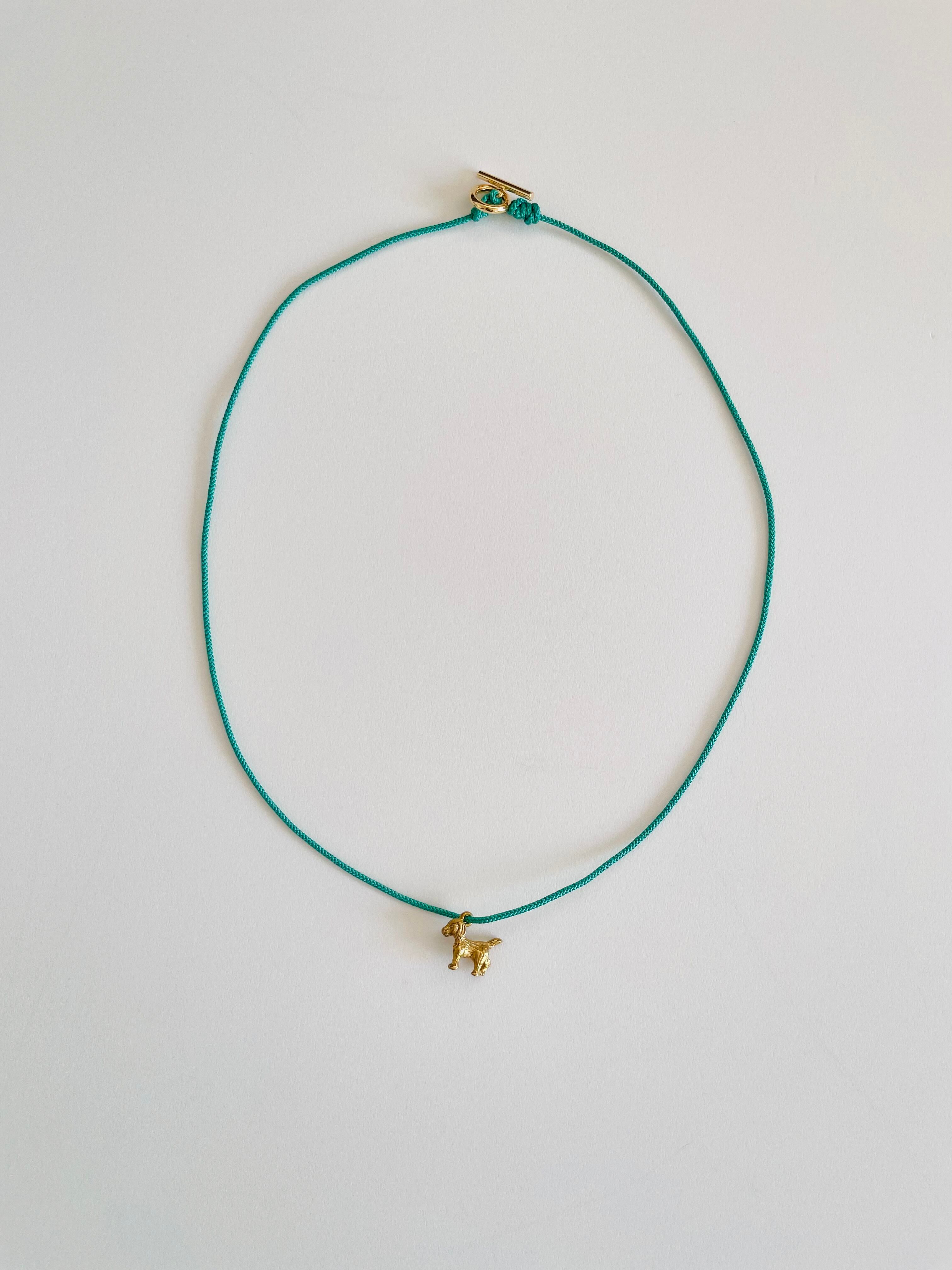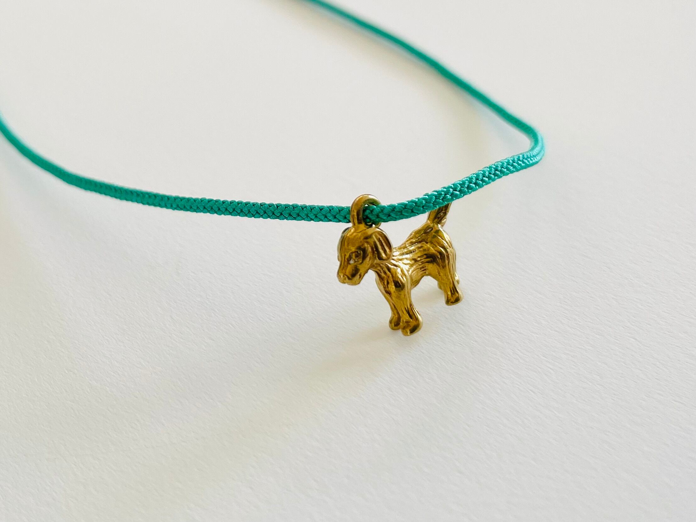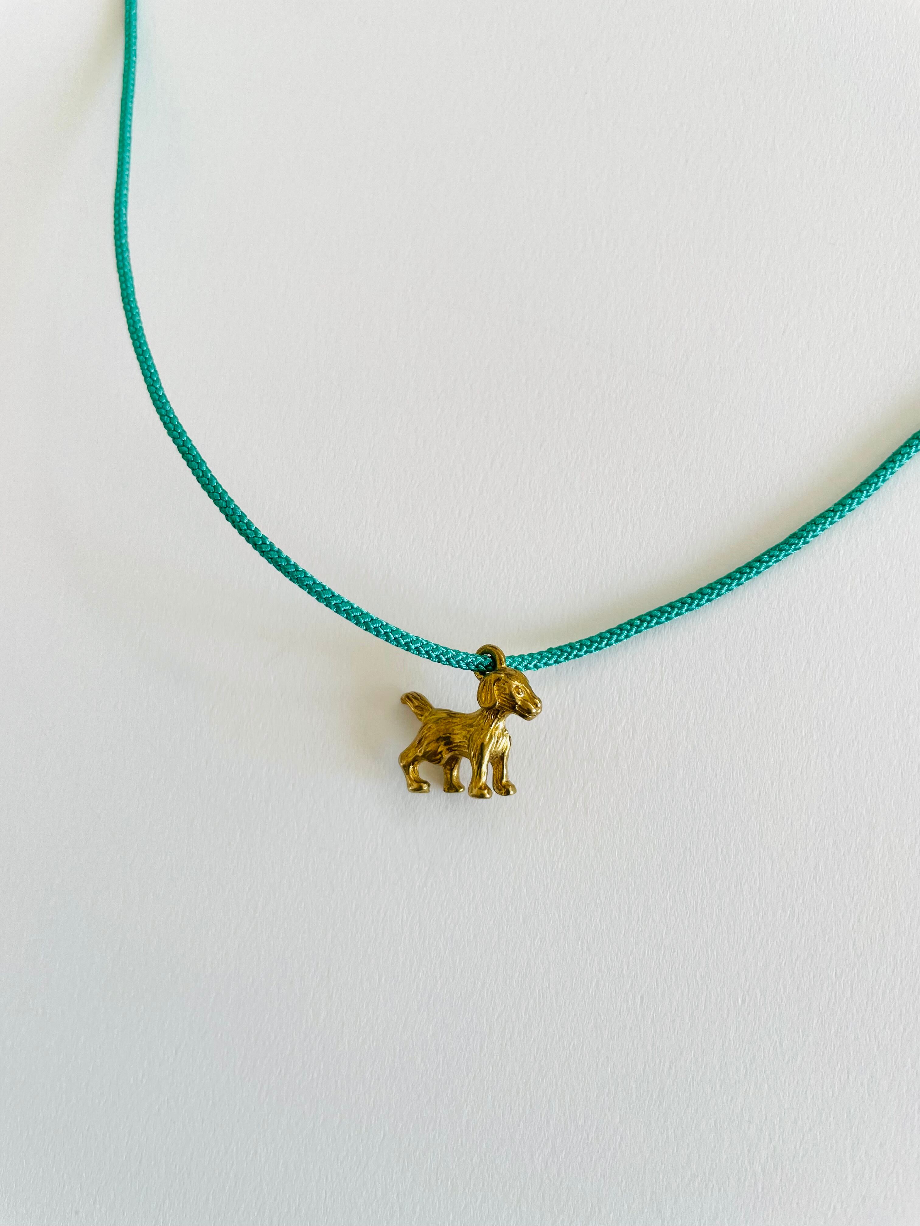 鮮やかなグリーンの紐と、かわいいわんこのチャームでネックレスを作りました。