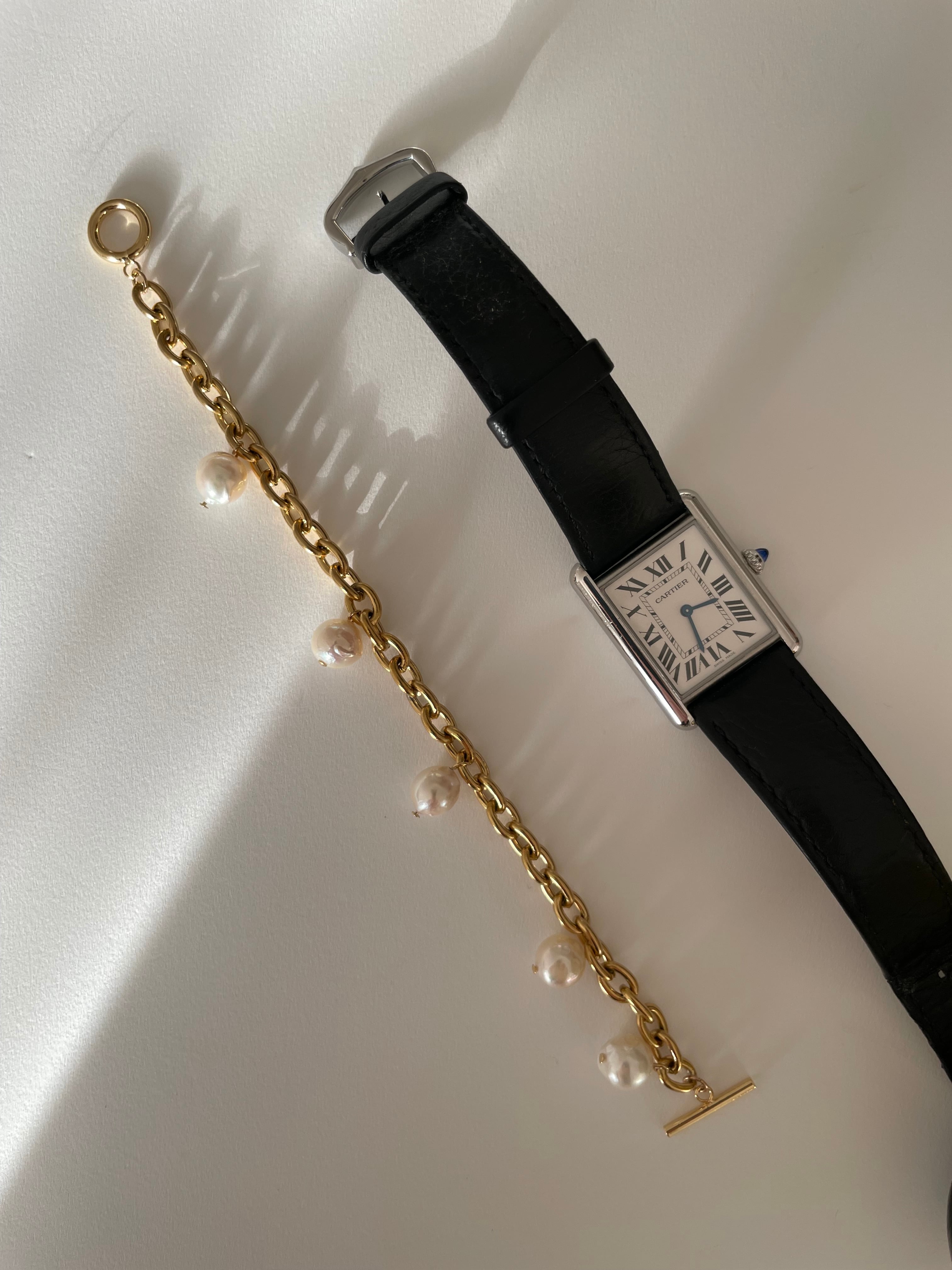 白玉のようなかわいいバロックパールとゴールドカラーのチェーンでブレスレットをお作りしました。