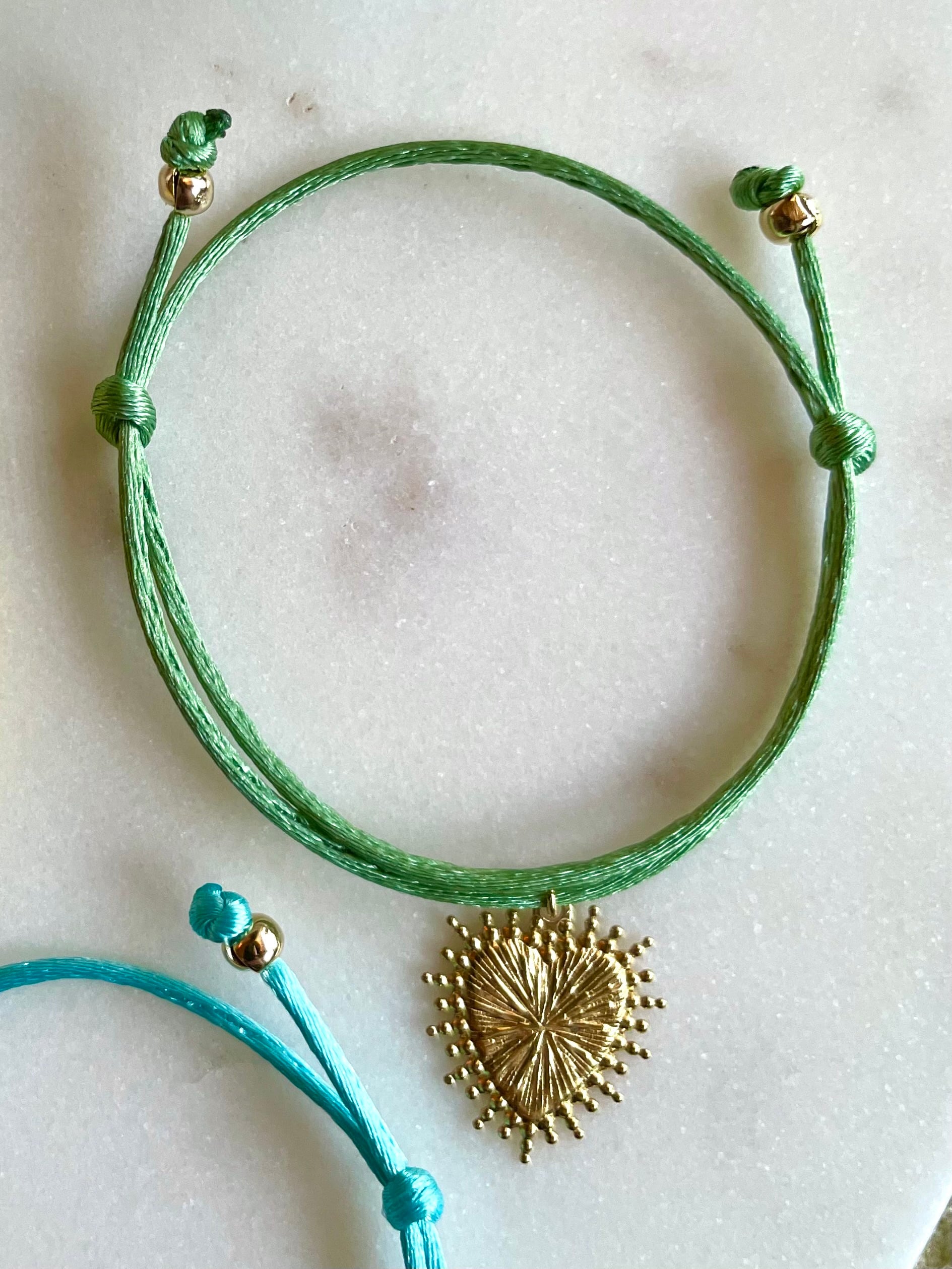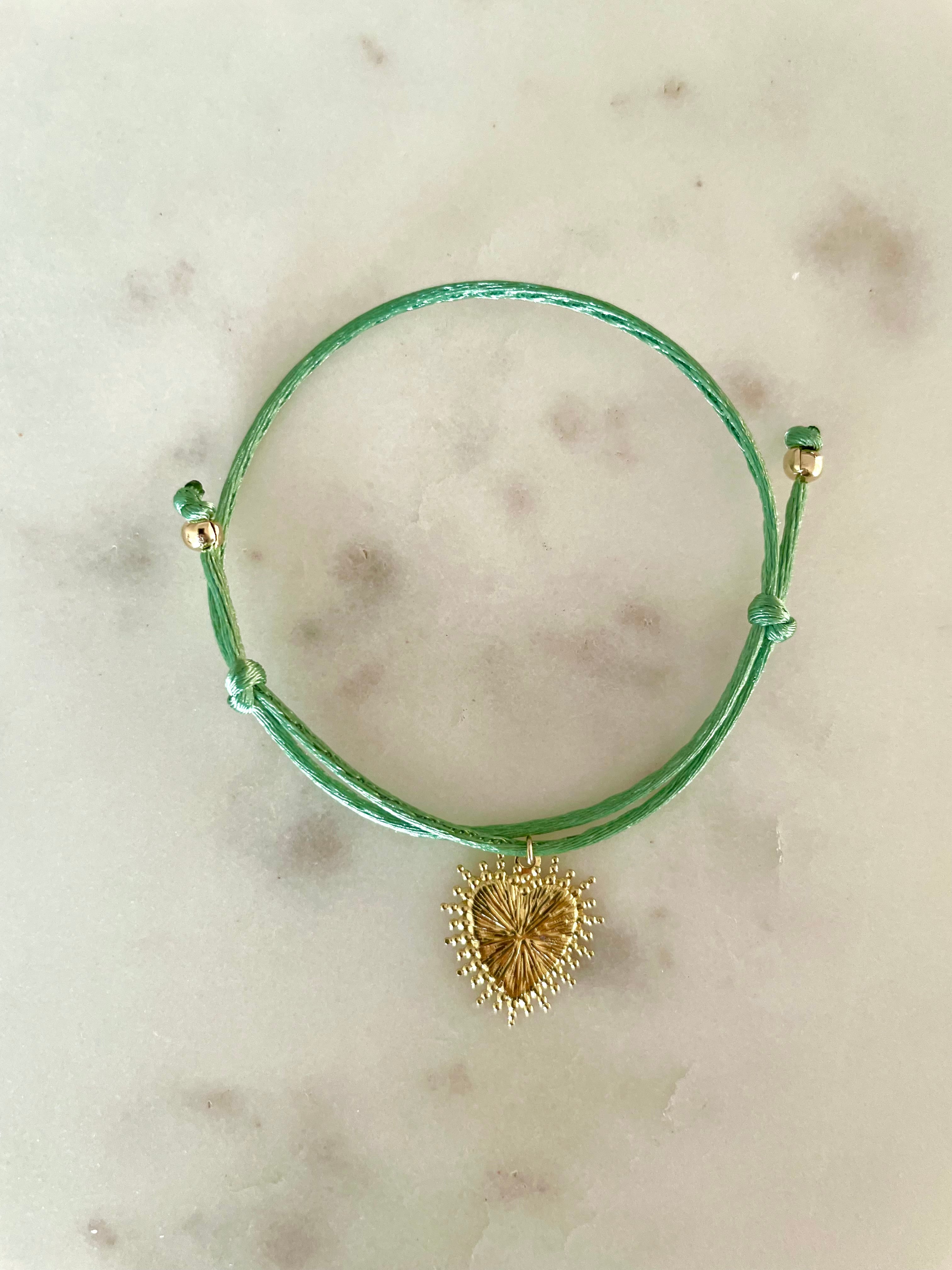ギザギザのハートのパーツをブレスレットにしました。ブレスレットのお色は薄いグリーン。他のブレスレットとの重ねづけもおすすめです。