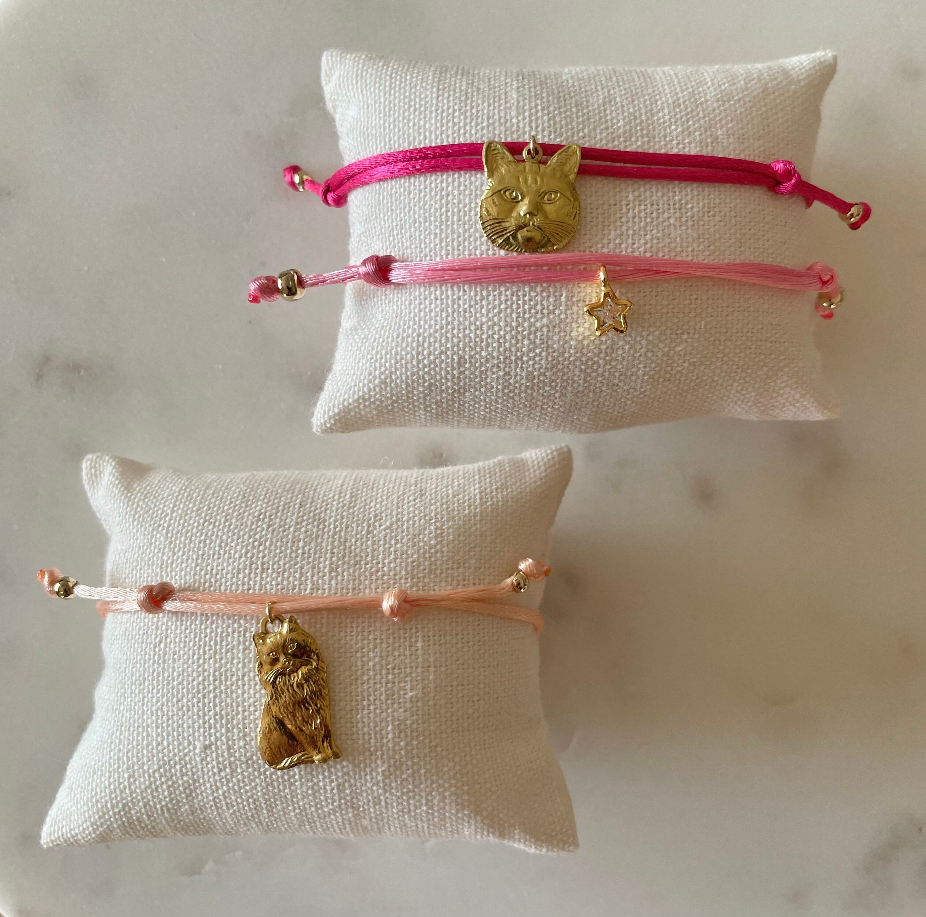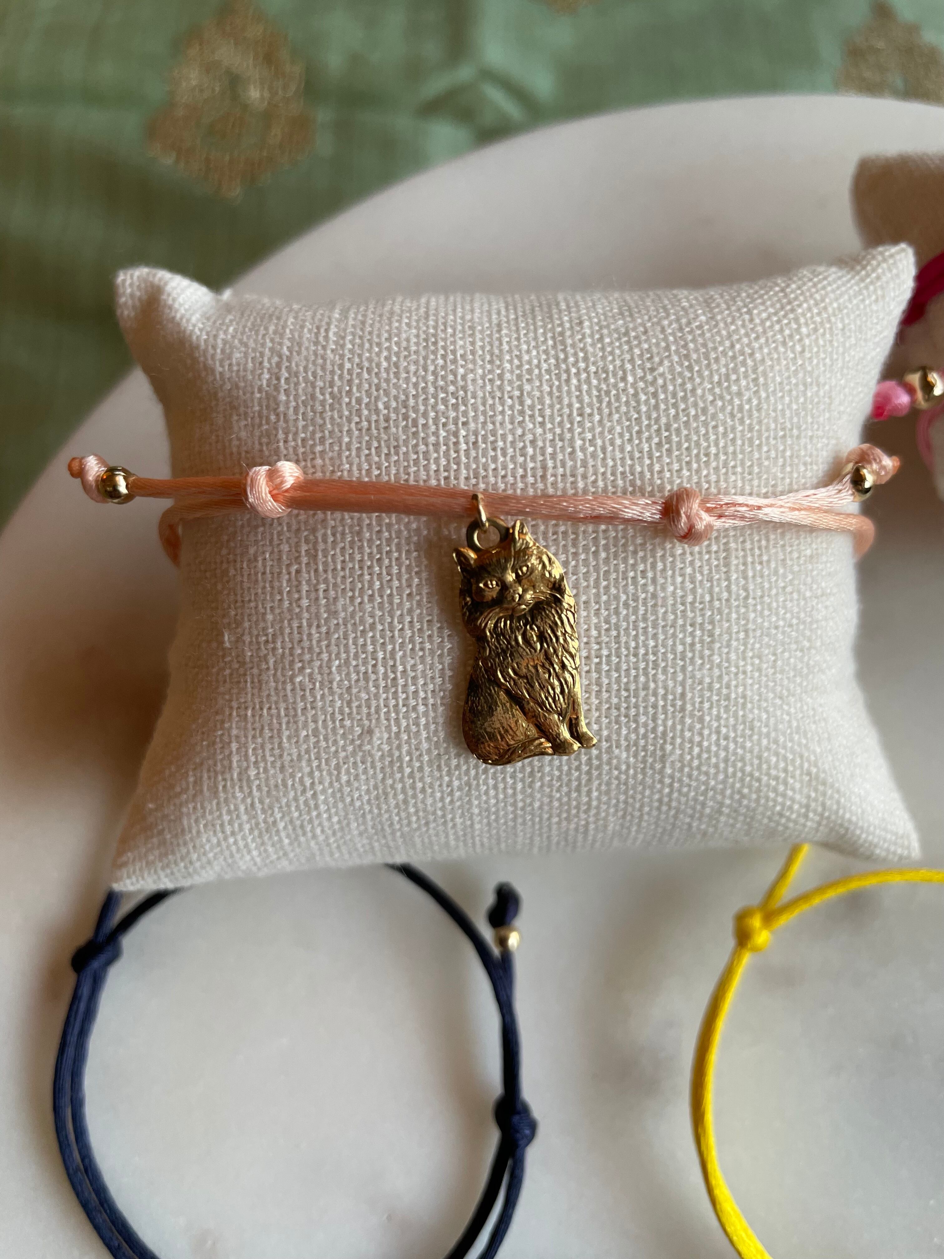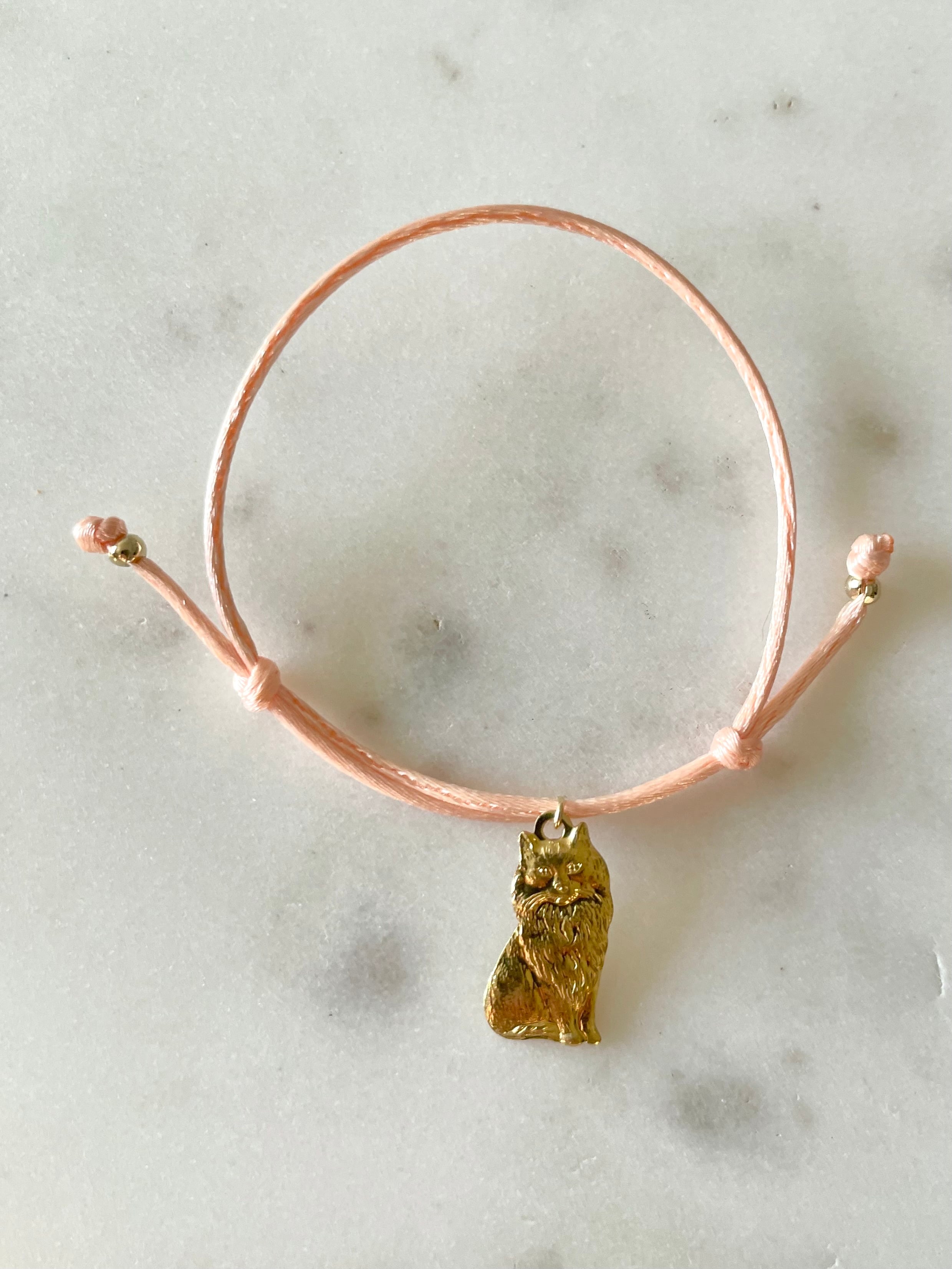 おしゃまな長毛猫のパーツをブレスレットにしました。ブレスレットのお色は薄いピンク。他のブレスレットとの重ねづけもおすすめです。